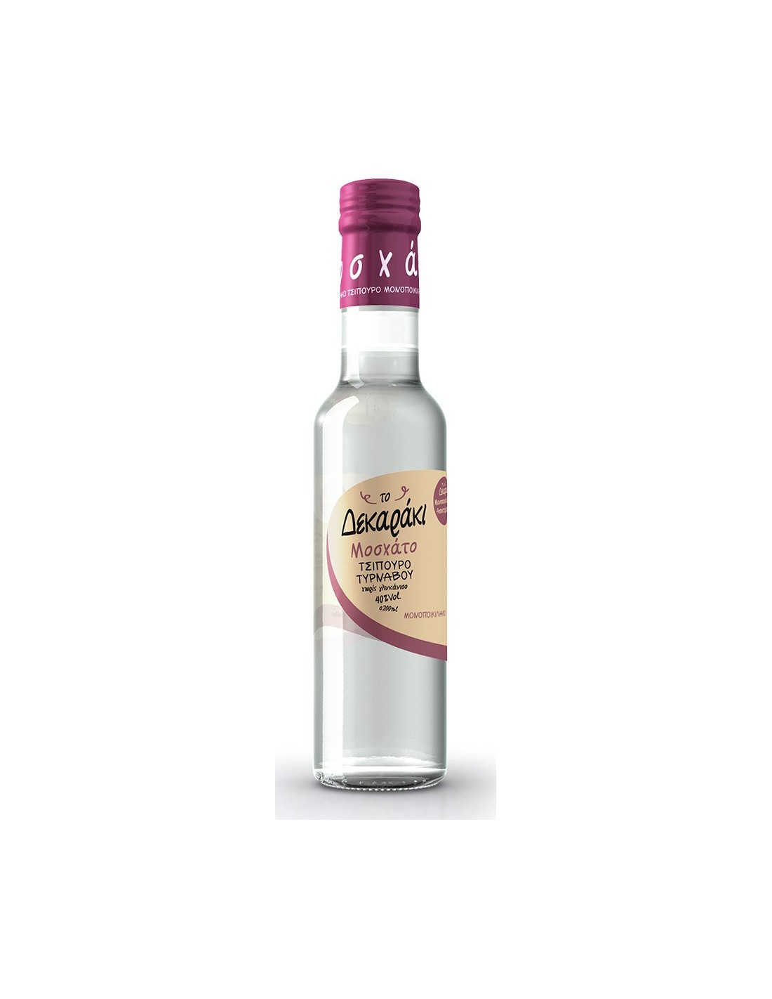 Το Δεκαράκι Μοσχάτο είναι το πρώτο μονοποικιλιακό τσίπουρο που αποτελεί προϊόν απόσταξης μόνο από Μοσχάτο Τυρνάβου, λαμβάνοντας έτσι στο μέγιστο τα ποιοτικά και αρωματικά χαρακτηριστικά της εκλεκτής αυτής ποικιλίας. Το μοναδικό άρωμα και η απαράμιλλη γεύση του, που γίνεται αισθητή από την πρώτη γουλιά, αποτελούν ακλόνητη απόδειξη των καταβολών του, της υψηλής ποιότητάς του αλλά και της τέχνης του αποσταγματοποιού.