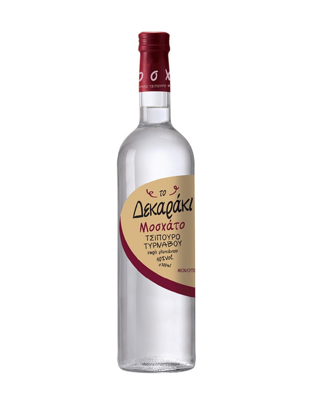 Το Δεκαράκι Μοσχάτο είναι το πρώτο μονοποικιλιακό τσίπουρο που αποτελεί προϊόν απόσταξης μόνο από Μοσχάτο Τυρνάβου, λαμβάνοντας έτσι στο μέγιστο τα ποιοτικά και αρωματικά χαρακτηριστικά της εκλεκτής αυτής ποικιλίας. Το μοναδικό άρωμα και η απαράμιλλη γεύση του, που γίνεται αισθητή από την πρώτη γουλιά, αποτελούν ακλόνητη απόδειξη των καταβολών του, της υψηλής ποιότητάς του αλλά και της τέχνης του αποσταγματοποιού.