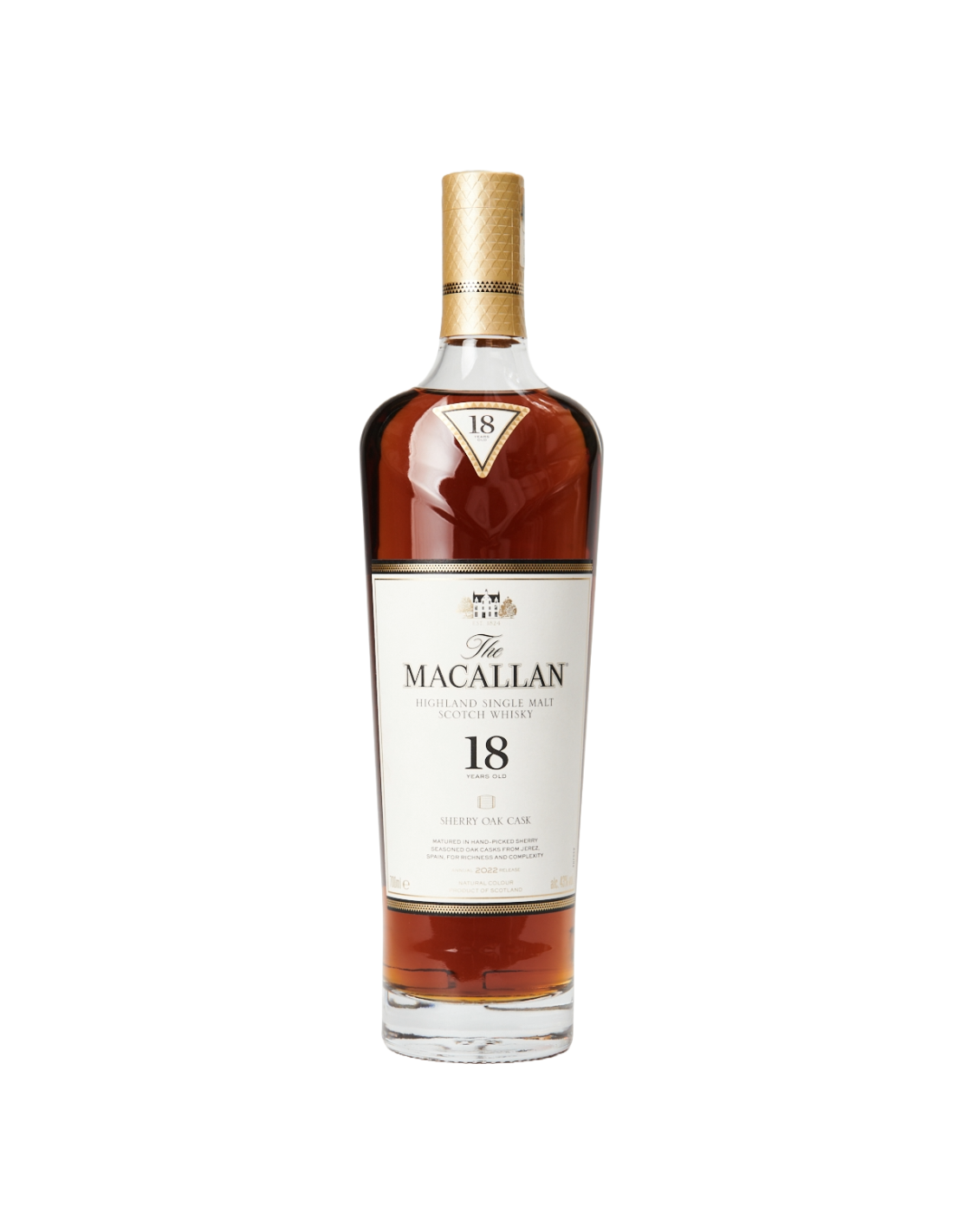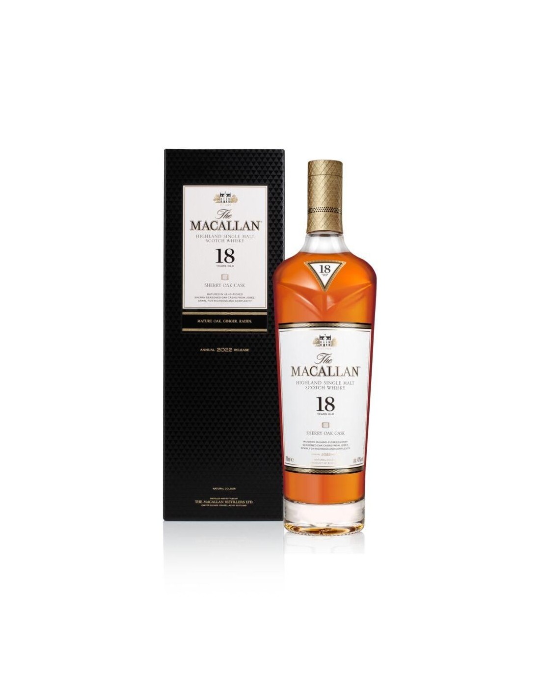 Το Macallan 18 Years Old Sherry Oak είναι ένα εξαιρετικό single malt ουίσκι, το οποίο έχει ωριμάσει για 18 χρόνια σε ευρωπαϊκά δρύινα βαρέλια, που έχουν προετοιμαστεί με sherry. Στη μύτη, αναδύονται αρώματα σιτηρών, μαύρης σοκολάτας και αποξηραμένων φρούτων, ενώ στο στόμα, το ουίσκι προσφέρει πλούσιες γεύσεις από καβουρδισμένα καρύδια, μελιού και μπαχαρικών, με μια μακρά, ζεστή επίγευση. Ιδανικό για όσους αναζητούν μία πολυτελή και γευστικά σύνθετη εμπειρία.
