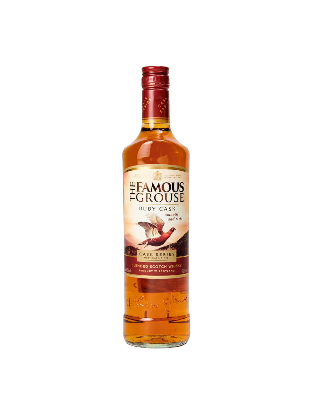 Το Famous Grouse Ruby Cask είναι ένα εξαιρετικό blended whisky που ωριμάζει σε βαρέλια από κόκκινο κρασί, προσφέροντας μοναδικές γεύσεις φρούτων, μπαχαρικών και γλυκιάς βανίλιας. Η διαδικασία αυτή προσδίδει στο whisky ένα βαθύ, πλούσιο χρώμα και μια ιδιαίτερη γευστική διάσταση με νότες κερασιού και ελαφριάς γλυκύτητας.